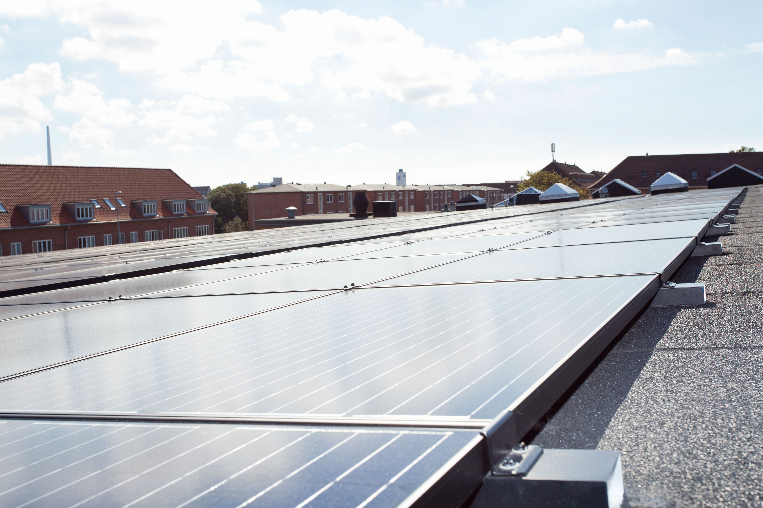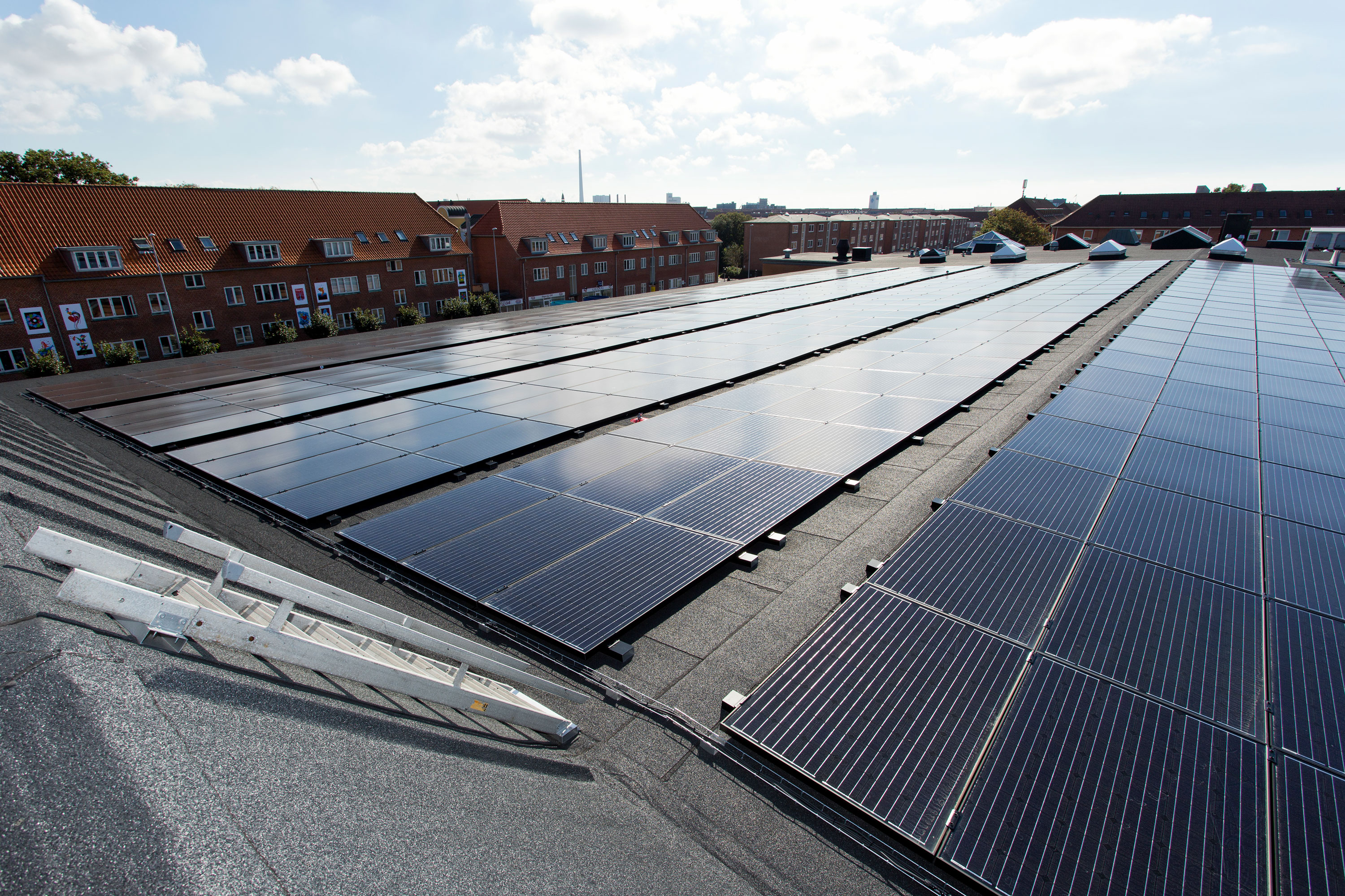 Solcelleanlæg på Esbjerg Svømmestadion monteret i forbindelse med en gennemgribende energirenovering.