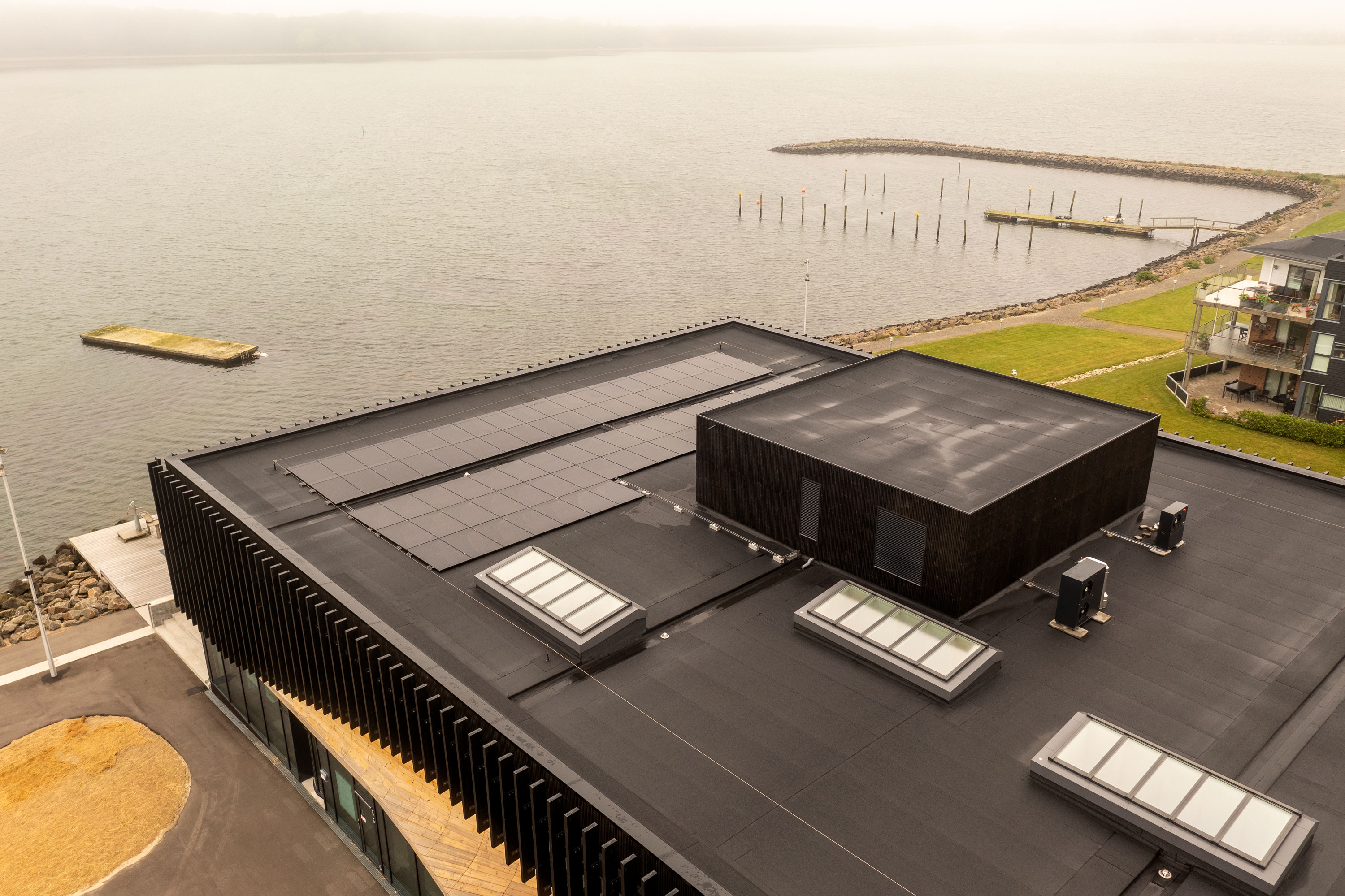 Som det ene bliver panelerne limet fast på tagpappet. Dermed undgår montørerne at gennembryde tagmembranen med skruer, som det er tilfældet med andre montagesystemer. Resultatet er et tag, der forbliver tæt i hele dets levetid. ”Og når nu bygningen huser både Lemvig Vand og Danmarks internationale klimacenter er det vel egentlig meget passende, at man har fået en løsning, der holder tæt,” siger Kim Slavensky med et skævt smil.